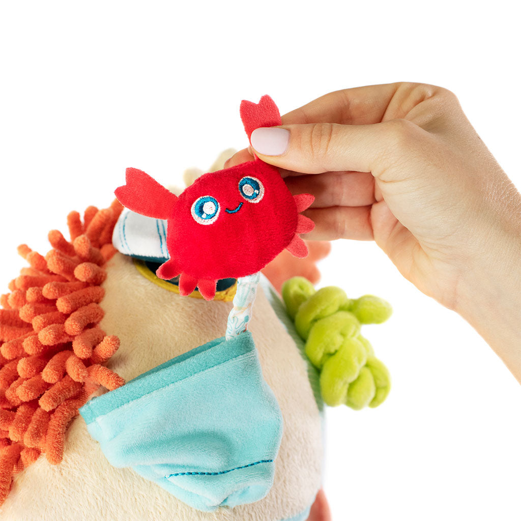 This captivating Sensorial Reef provides sensory stimulation through its soft texture, vibrant colours, and delightful sounds. Babies will love exploring and interacting with the removable baby octopus-shaped rattle. As they touch, bite, and shake the soft coral reef, they engage their senses of touch, sight, and hearing, fostering sensory stimulation and cognitive development. The vibrant colours and textured surface provide a rich sensory experience, while the removable baby octopus-shaped rattle adds an extra layer of interactive play.