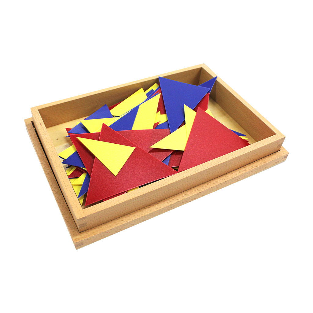 Using the Montessori grammar symbols, the adjective is represented by the triangle. In the box, children will find combinations of triangles with different properties. This experience demonstrates the function of the adjective as the describing word.