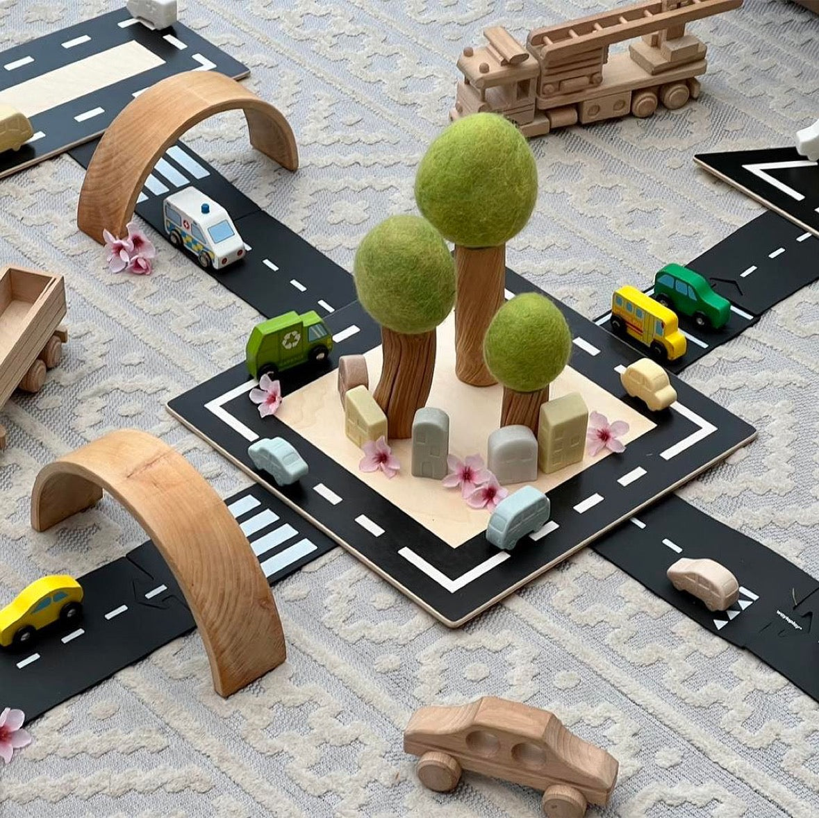 Encourage mathematical language and thinking in everyday play with the Shape Drive Arounds connectors set. This set pairs perfectly with the Shape Drive Arounds set, allowing children to expand their small world play and connect the shapes via various connectors. This set includes a square crossroads, 2 semi-circle road pieces, 2 long road connectors, and 4 short road connectors, that children can incorporate into their small world imaginative play. These connectors are hand-made from beautiful beech wood. Children’s imaginations will soar as they create little worlds of their own. The opportunities are endless!