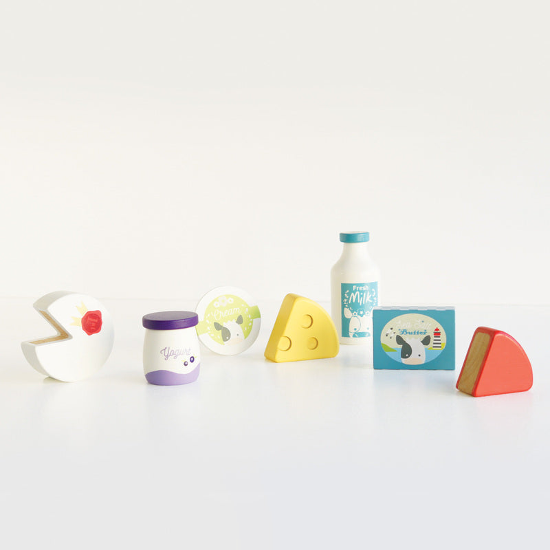The Le Toy Van Cheese & Dairy Crate is a fantastic addition for dramatic play. The Cheese & Dairy set features fresh milk, a block of butter, a pot of yogurt, a pot of cream and 3 delicious cheeses for all the cheese lovers! This wonderful set will help assist children develop their creative thinking and social skills through pretend play. Suitable for ages 2+.