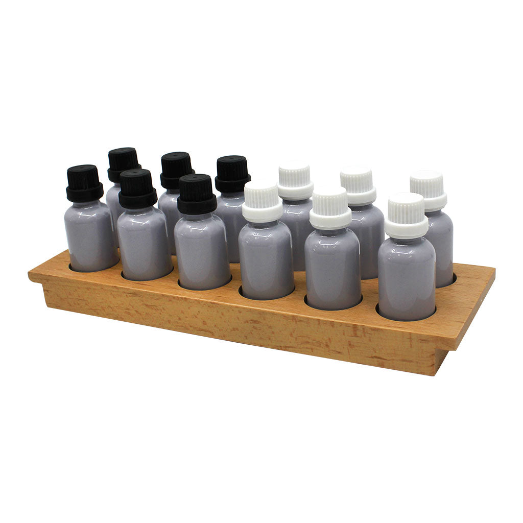 The Smelling Bottles are used to develop and refine children's sense of smell. By pairing scents, children use their olfactory sense to find similarities and differences. The scents also introduce descriptive language as children explore sweet, sharp, faint, strong and other discoveries.
