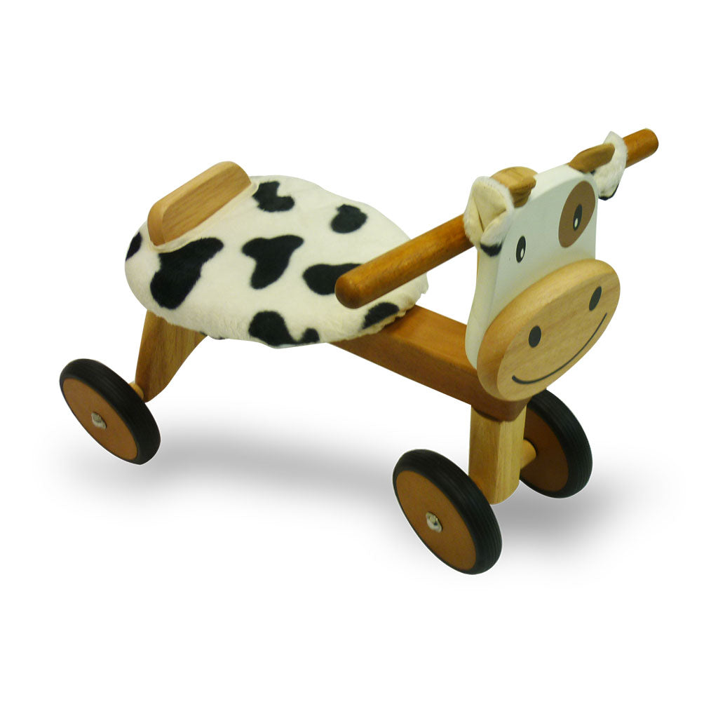 - A ride-on cow featuring a sturdy wooden trike with a comfortable seat.