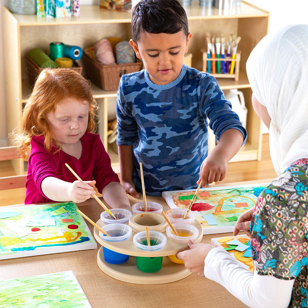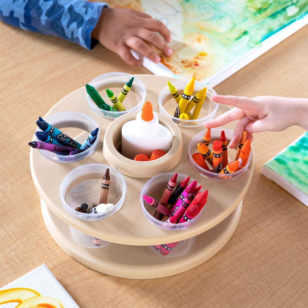 Encourage sharing and collaboration in children’s art spaces with this convenient, spinning art storage. Provide children with a mess-free solution to paint and supply sharing with inset cups and rubber feet that prevent spilling or tipping.