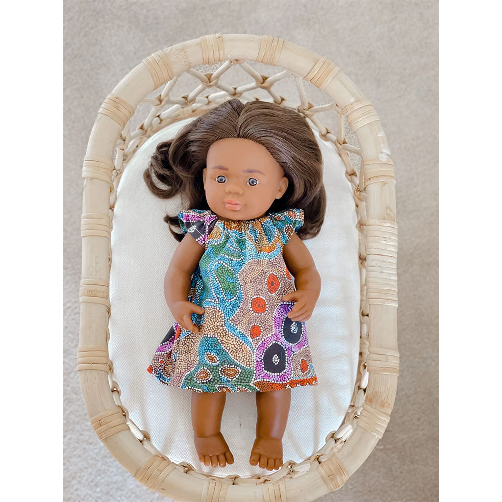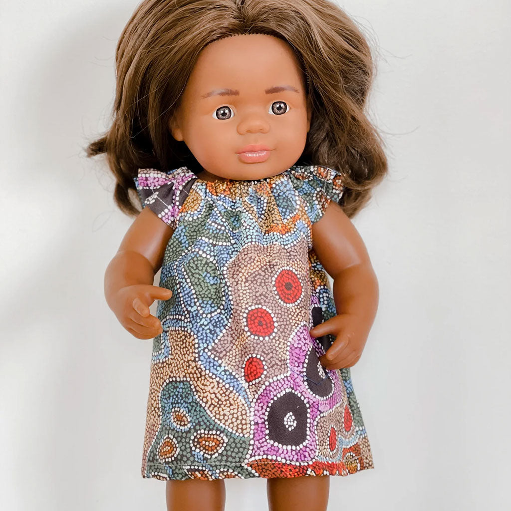 The Desert Fringe-Rush Dreaming Indigenous Flutter Dress is a beautifully designed and child-friendly doll’s dress which promotes cultural awareness for children to further their learning about Indigenous Australia. The dress is perfect for little hands as it has been designed with no Velcro, zips or clips and can be easily stretched around the neckline to slip over the head or up and over the legs whilst tucking the arms in.