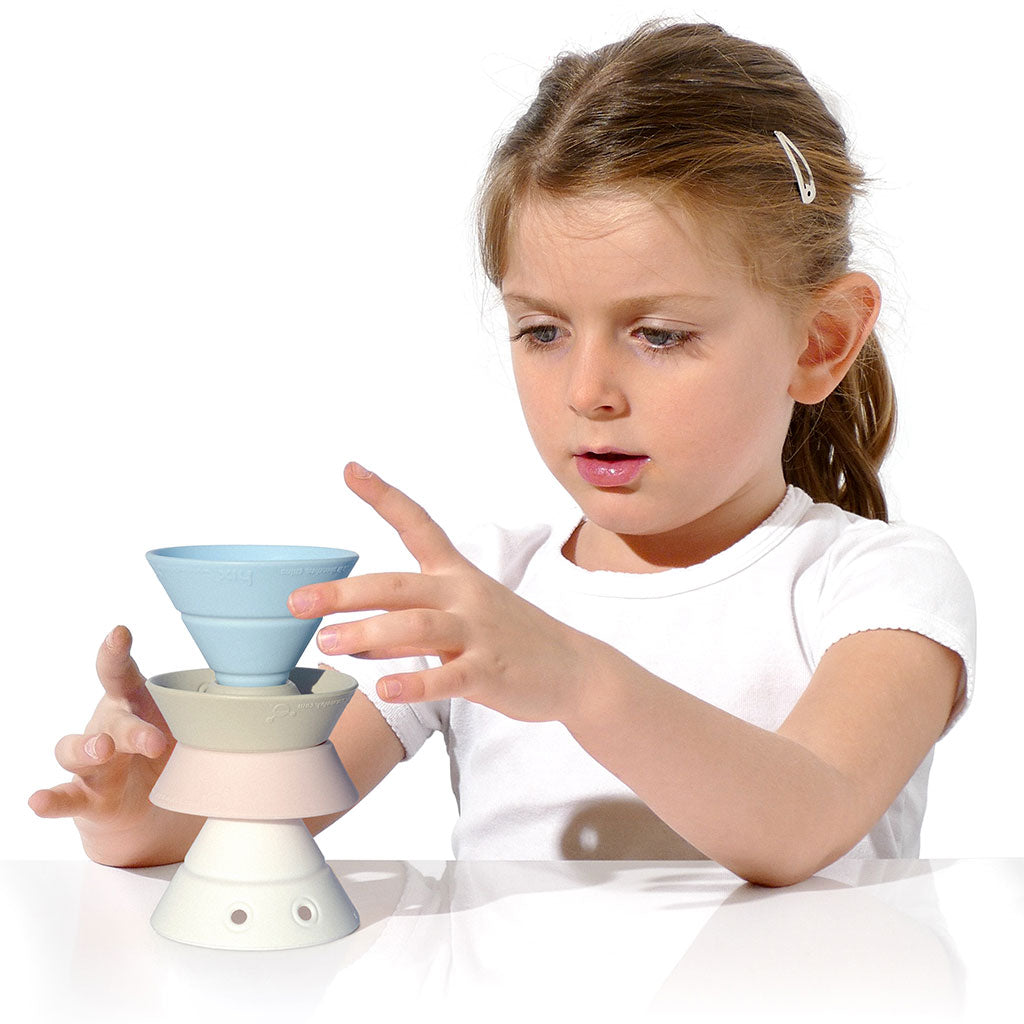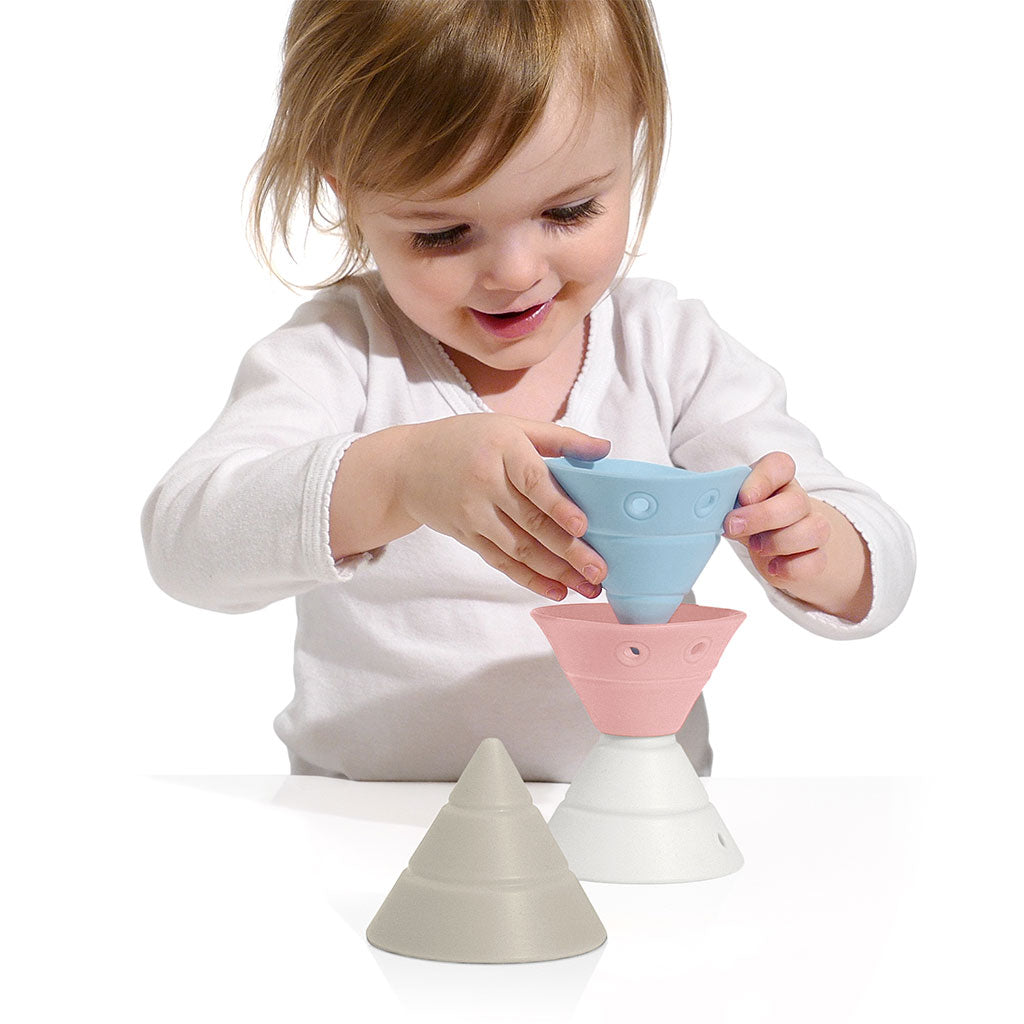 Designed to delight and engage children of all ages, Hix is the ultimate versatile toy that makes geometry accessible and fun. Made from soft and durable silicone rubber, Hix is a set of four pastel-coloured cones that can be transformed into four basic shapes, allowing for endless configurations, and stacking possibilities.