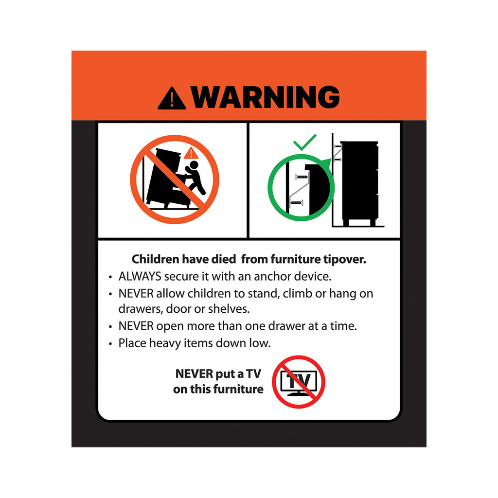 WARNING – This furniture has a risk of falling over. Wall anchors should be used when an item has a warning tip over label. Never allow children to stand, climb or hang on drawers, doors or shelves. Never open more than one drawer at a time. Place heavier items down low. Children have died from furniture tip over.