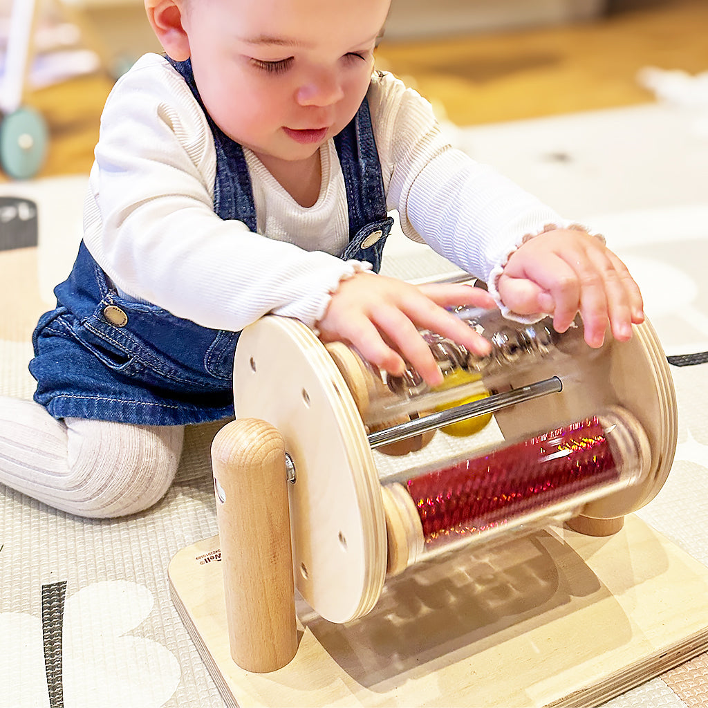 Ideal for the early years, this stimulating sight and sound drum features 4 individual tubes which each enclose a different visually or auditory engaging material, as well as featuring a set of clacking wooden spheres. One tube features small pieces of plastic that sound like rain as they gently brush against each other, others feature small bells, marbles and coloured diffraction foil. The entire drum spins with minimal effort, as well as the individual tubes.