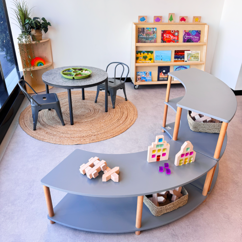 The modern, curved open shelf unit with 3 shelves is functional, beautiful and inspired by Scandi design. Its versatility and lightweight design allow it to be used in so many ways. The curved shape assists creating quiet spaces and symmetry to the space as well as fun new ways to design the room. Create semi circles, ‘S’ shapes, snakes or circles with these versatile shelves.
