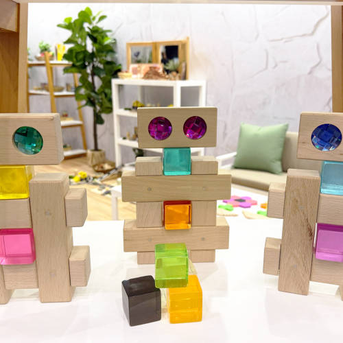 The 45pc Wooden Gem Block set encourages building, construction and imaginative play in small world settings. The set features 40 double gem blocks and 5 solid wood blocks to complete the set. Use for construction play with that little bit extra pizazz. The beautifully crafted soft beech wood showcases the vibrant colours in this set.